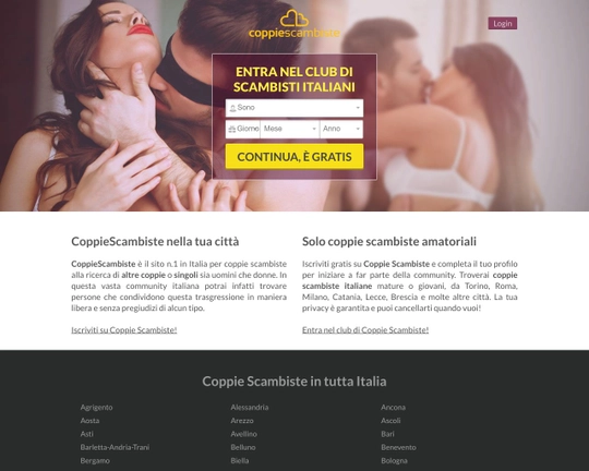 CoppieScambiste è una piattaforma online che facilita gli incontri tra coppie già impegnate e singoli, sia uomini che donne, alla ricerca di nuove esperienze di scambio uniche. Questo sito permette ai suoi membri di esplorare il mondo dello scambismo in un ambiente senza pregiudizi e con la massima riservatezza. La community italiana è ampia e variegata, includendo persone di tutte le età e da ogni parte del paese, come Torino, Roma, Milano, Catania, e molte altre città.